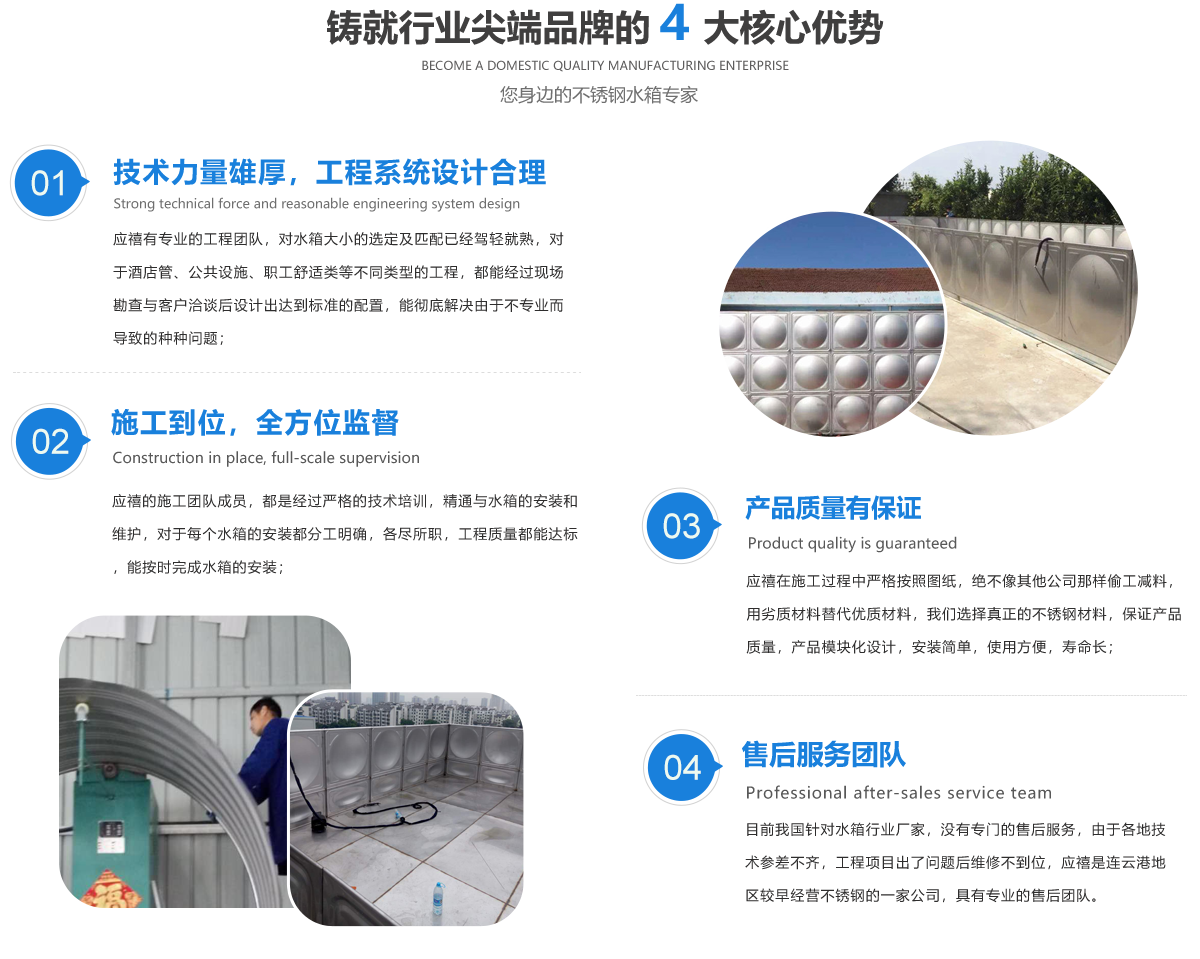 連云港應(yīng)禧不銹鋼水箱有限公司,地處江蘇省連云港市東??h安峰鎮(zhèn),是一家生產(chǎn)圓柱形、拼裝形不銹鋼生活水箱、工業(yè)水箱、消防水箱、聚氨酯整體發(fā)泡保溫水箱(與熱水工程、太陽(yáng)能熱水工程、熱泵熱水工程、鍋爐熱水工程等配套使用)、醫(yī)用專(zhuān)用不銹鋼水箱為主導(dǎo)的生產(chǎn)型企業(yè)。公司本著“質(zhì)量第一、服務(wù)至上、交貨及時(shí)”的原則,真誠(chéng)......